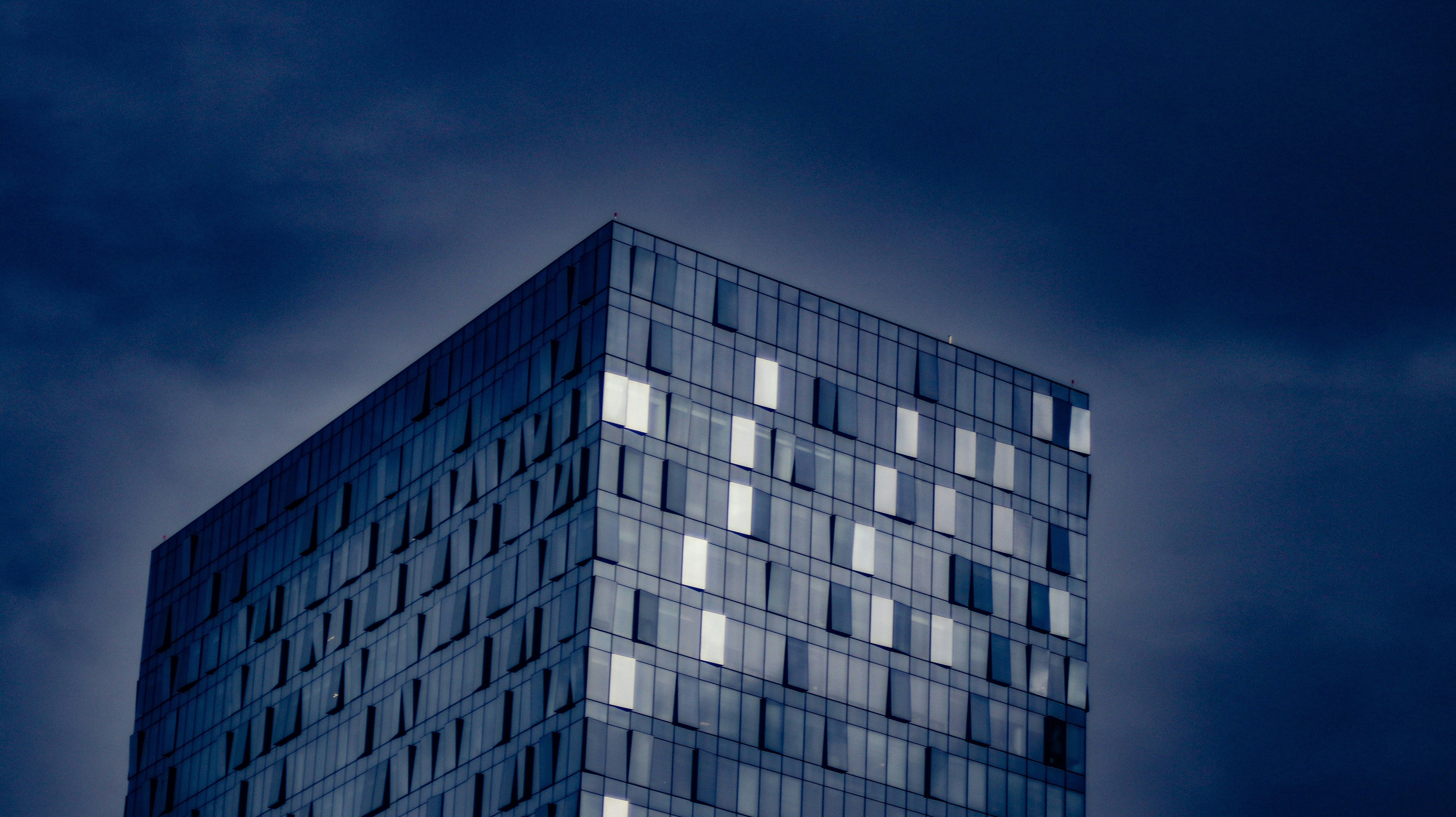 Modern Indian business district at dusk, glass towers reflecting amber light, deep shadow architecture, atmospheric dark skyline
